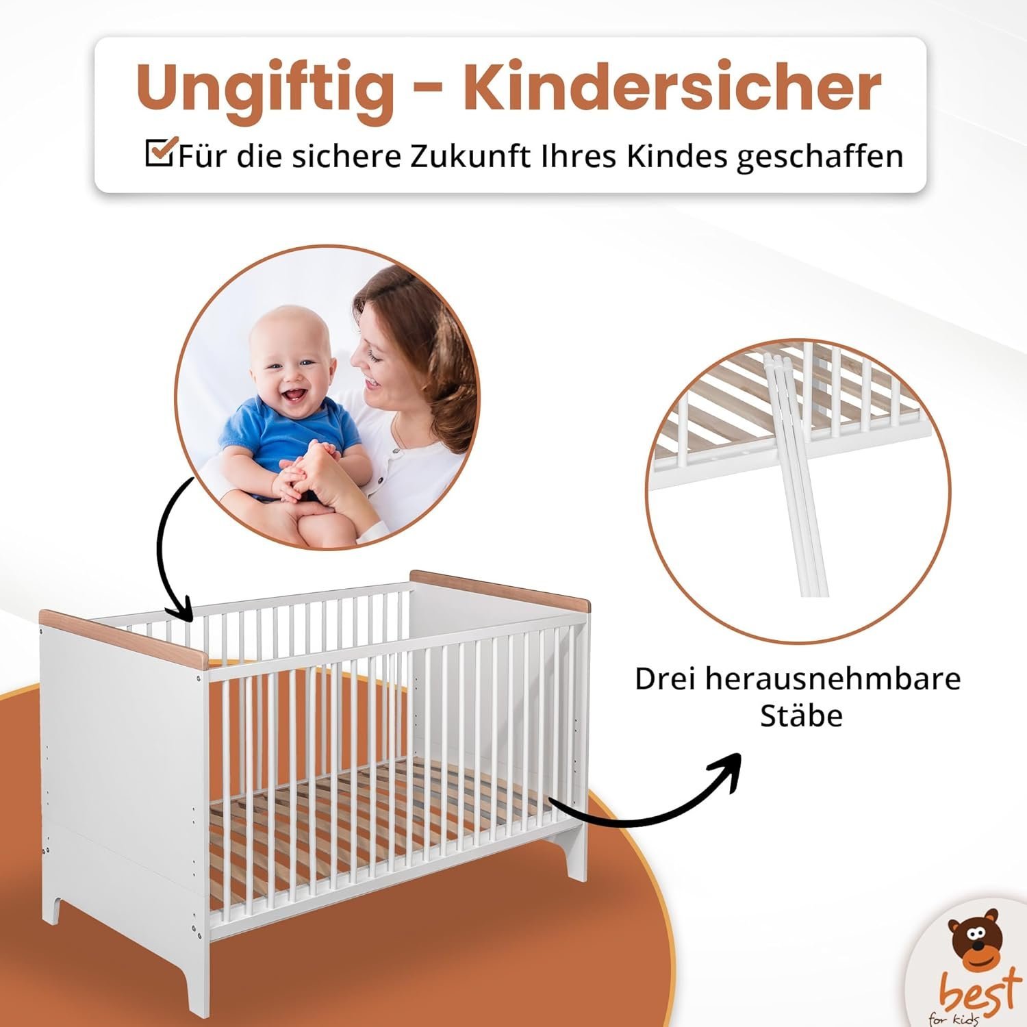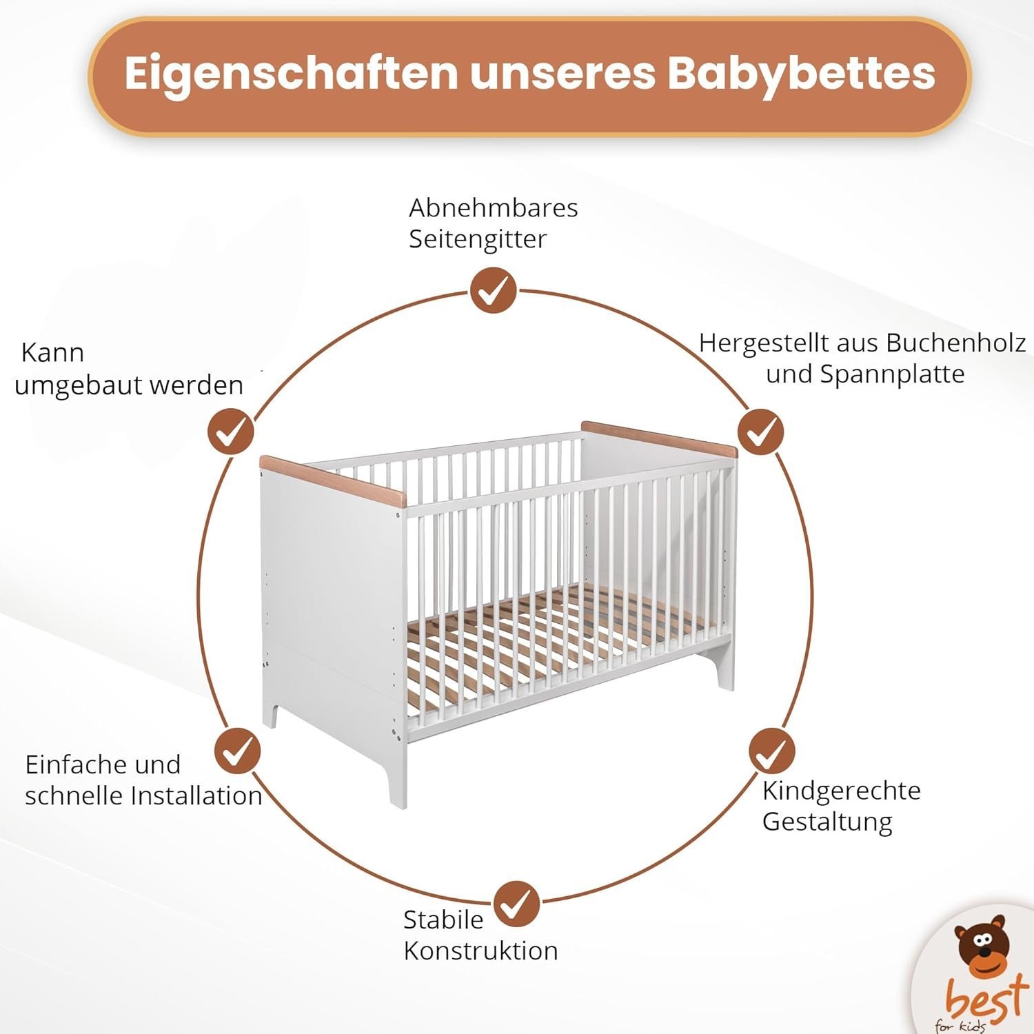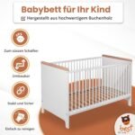 🌳 Hochwertige Materialien für Sicherheit und Komfort: Dieses Gitterbett besteht aus hochqualitativem Buchenholz, das für seine Haltbarkeit und Robustheit bekannt ist. Die Vorderseite ist mit einer HDF Buchenplatte versehen und mit einer ökologischen, für Kinder sicheren zertifizierten Farbe bemalt. Dadurch wird eine sichere und gesunde Schlafumgebung für Ihr Baby geschaffen, in der es sich geborgen fühlen kann. 🔒😊