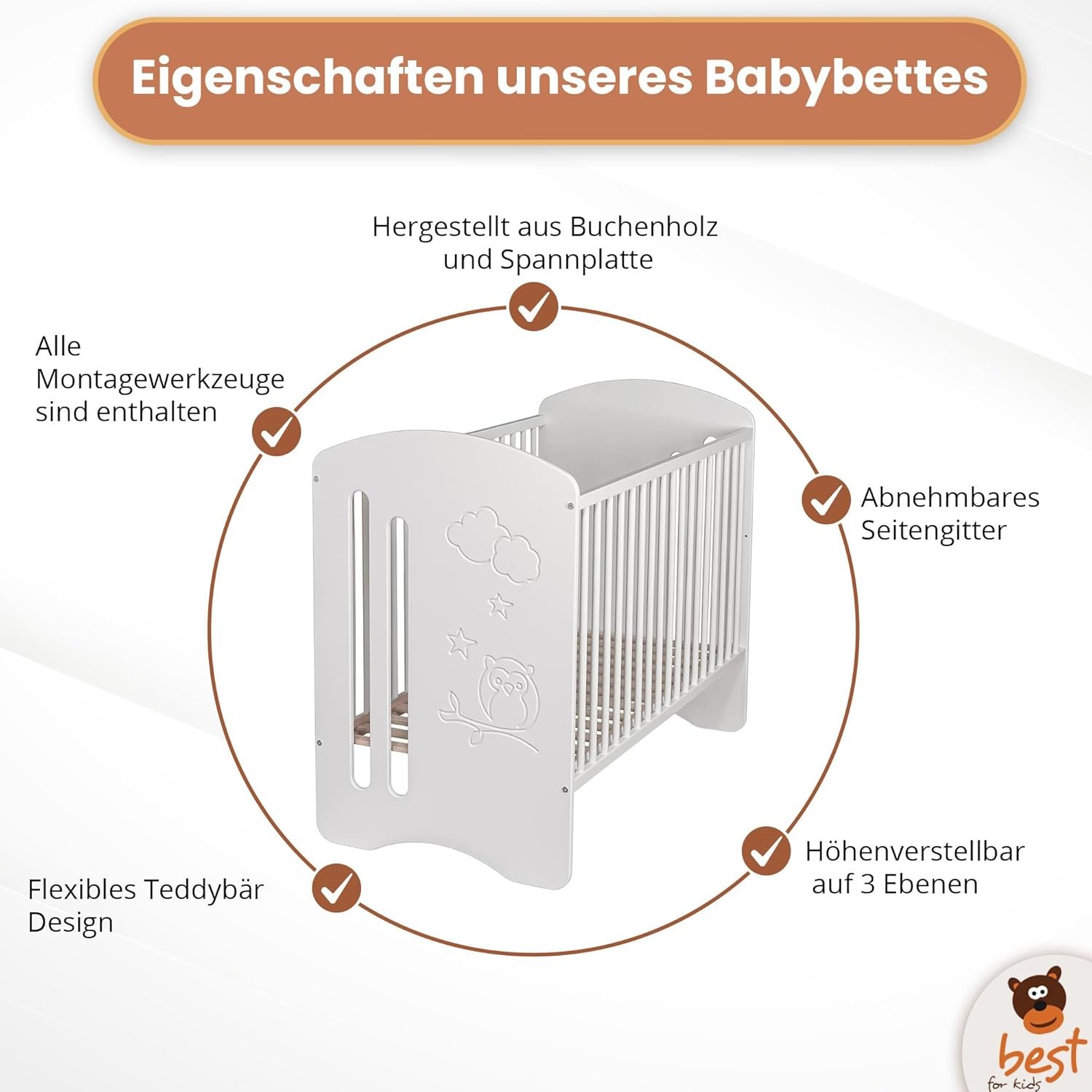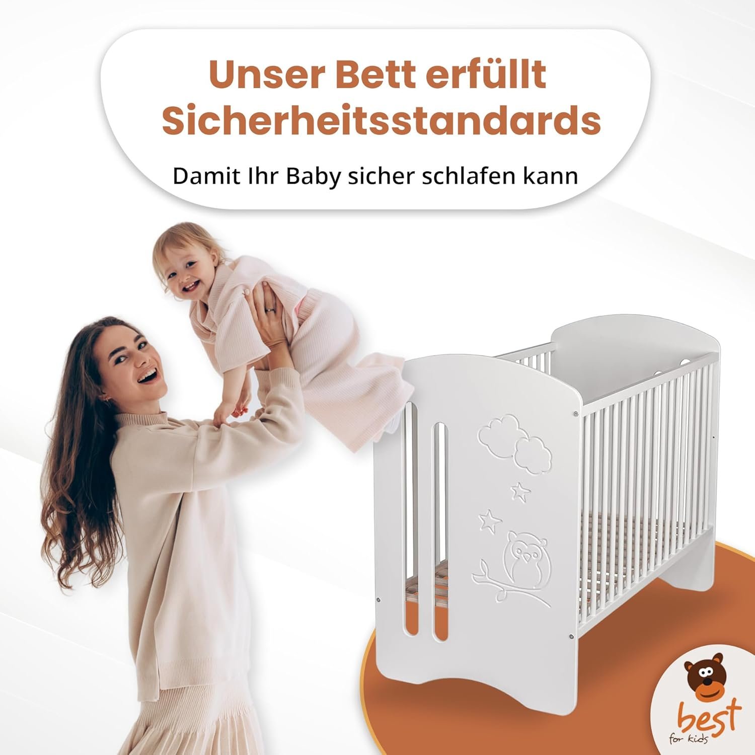 Best For Kids Gitterbett ohne 10 cm Matratze aus Schaumstoff Zertifiziert Geprüft, Kinderbett Babybett Weiß 120×60