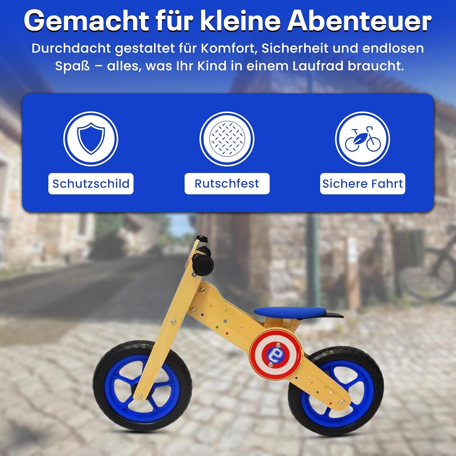 Das 12-Zoll Kinder Laufrad aus hochwertigem, robustem Holz bietet maximale Stabilität, Sicherheit und Langlebigkeit für den täglichen Gebrauch und ist somit der perfekte Begleiter für Kinder ab etwa 2 Jahren. Die sorgfältig verarbeitete Holzkonstruktion mit glatter Oberfläche und abgerundeten Kanten sorgt für sichere Nutzung drinnen wie draußen und gewährleistet stundenlangen Spielspaß. Mit dem Kinder Laufrad können Kinder spielerisch Gleichgewicht, Koordination und motorische Fähigkeiten trainieren, während sie gleichzeitig Selbstvertrauen und Unabhängigkeit entwickeln. Das Laufrad ist komplett ohne Pedale konstruiert, sodass die Kleinen eigenständig lernen, das Gleichgewicht zu halten und die Bewegung zu kontrollieren – eine ideale Vorbereitung auf das spätere Fahrradfahren. Dank des höhenverstellbaren Sattels wächst das Kinder Laufrad mit Ihrem Kind mit und kann über mehrere Entwicklungsphasen hinweg ergonomisch genutzt werden, wodurch es zu einer langfristigen, nachhaltigen Anschaffung für aktive Kinder wird. Das Kinder Laufrad unterstützt Kinder dabei, sicher, selbstständig und mit Freude zu fahren, während die robuste Bauweise maximale Stabilität bietet.