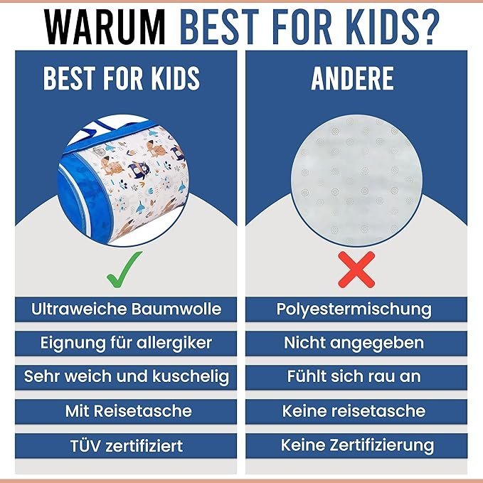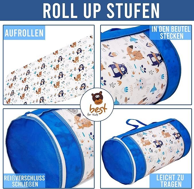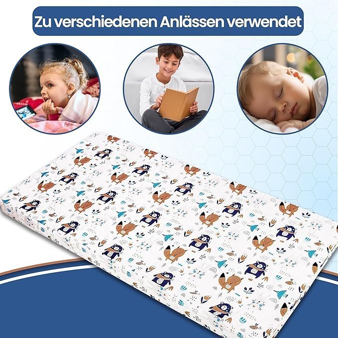 Best For Kids Kindermatratze 70×140 | Kinder Klappmatratze mit Blauem Reisetaschen-Bezug |Baby Matratze 70×140 aus 100% kuschelig weicher Baumwolle |Reisebett-Matratze | Bodenmatratze Kinder Waldtiere