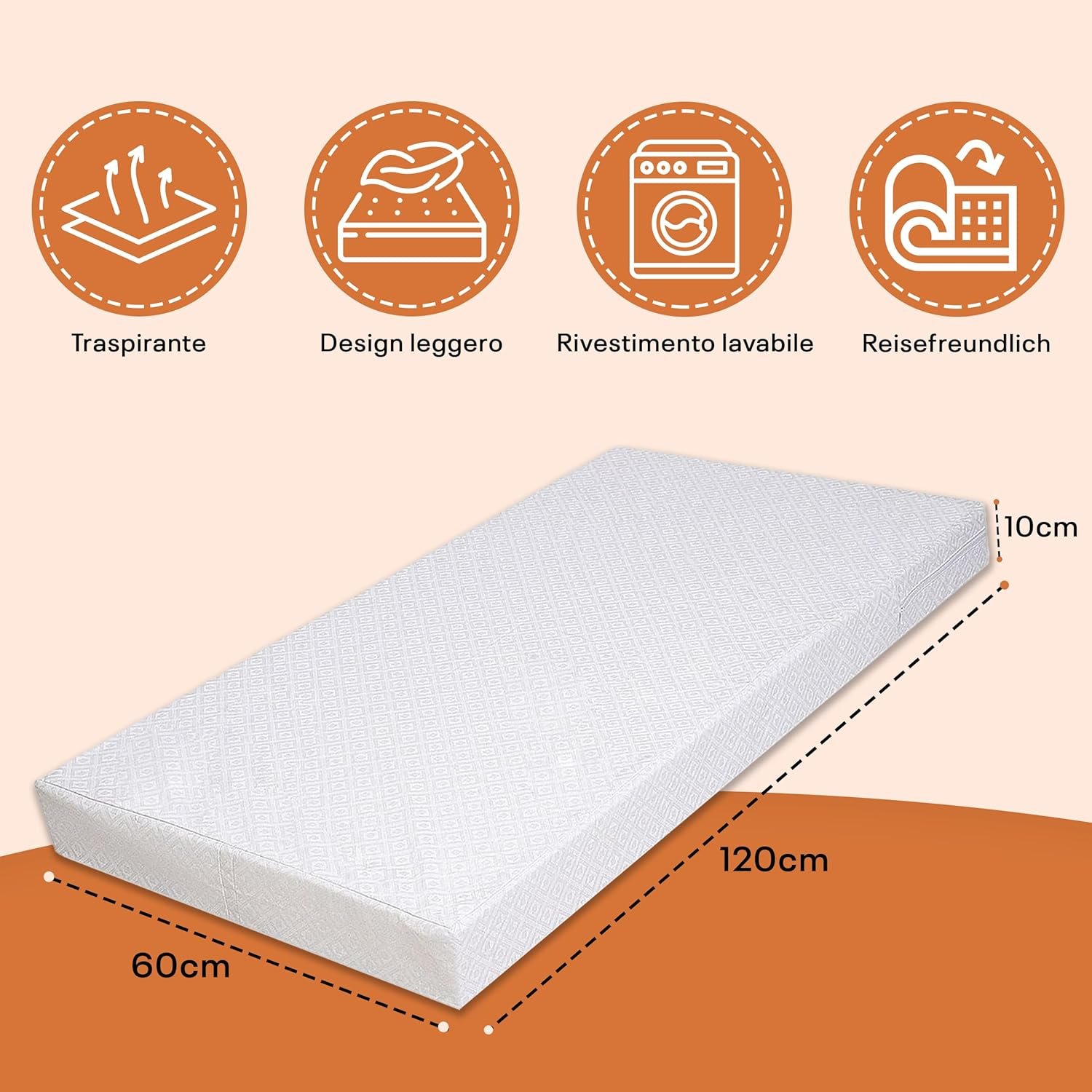 Ergonomisches und wendbares Design (60x120x10 cm) für vielseitigen Einsatz: Die Matratze ist leicht wendbar und unterstützt alle Wachstumsphasen Ihres Kindes, wodurch sie sich optimal an die Bedürfnisse von Babys und Kleinkindern anpasst und so maximalen Komfort garantiert.