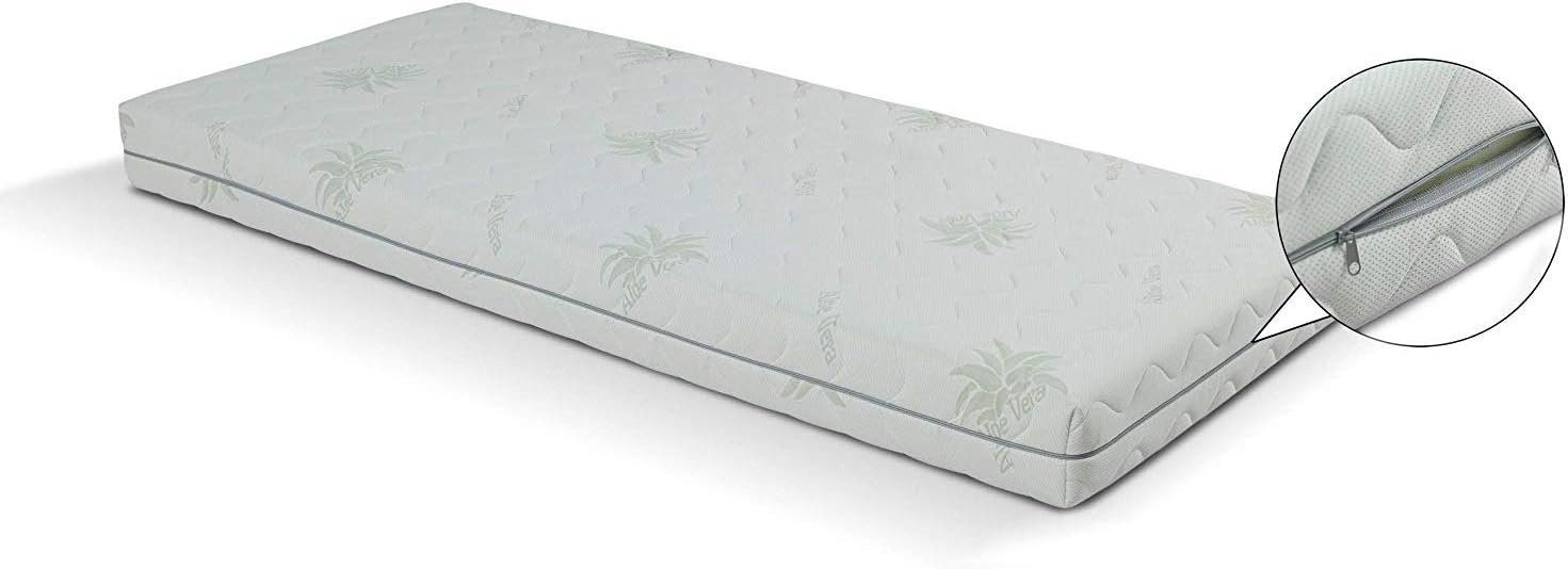 Info zu diesem Artikel 💖 Universelle Schaumkernmatratze 10 cm hoch ausgestattet mit einem atmungsaktiven Komfortschaumkern der -ZERTIFIZIERT ist, garantiert eine ausgezeichnete Assimilation an die Körperform. 15 Größen zur Auswahl. 💖 Kern: 100% Polyurethan, dieser offenporiger Komfortschaumkern gewährleistet optimale Druckentlastung, Punkelastizität und darüber hinaus Atmungsaktivität. Hochwertiger und schadstofffreier Schaumstoff. 💖 Bezug Aloe Vera mit Reißverschluss waschbar bis 40°C Grad. Das für die Herstellung des Bezugs eingesetzte Material wurde mit einem speziellen Aloe-Vera-Gel mit kosmetischen und für die Haut wohltuenden Eigenschaften durchtränkt. Durch den Reißverschluss ist der Bezug reibungslos abnehmbar darüber hinaus ist er für Allergiker geeignet. 💖 Kernhöhe: ca. 10 cm / Gesamthöhe: ca. 11 cm, Schadstoffgeprüfte Textilware ÖkoTex Norm 100. Hoher Härtegrad N25 für die beste Elastizität der Matratze. 💖 Der Bezug aus 100% sanften und feinen 300g/m² Aloe Vera Polyester. Hergestellt in der EU.
