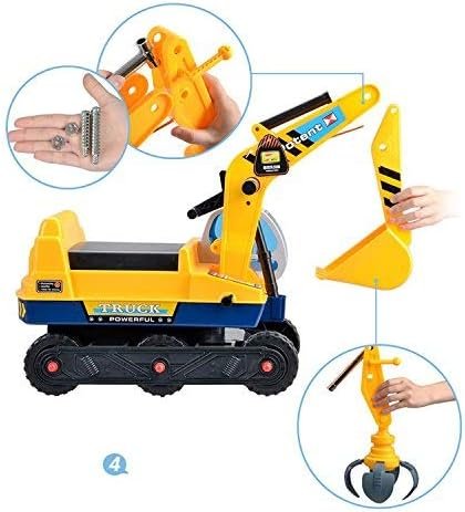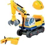 Der Sitzbagger wird mit zwei austauschbaren Schaufelaufsätzen geliefert – einer Baggerschaufel und einer Krallenschaufel. Der mitgelieferte Bauhelm sorgt für realistisches Rollenspiel und mehr Spielvergnügen. -