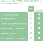 3. Das fein gewebte Jersey-Material mit ca. 160 g/m² ist nach Öko-Tex Standard 100 geprüft, hautfreundlich, atmungsaktiv und formstabil. Auch nach vielen Wäschen behält das Laken seine Form, bleibt weich und komfortabel und bietet ein hygienisches, dauerhaft angenehmes Schlafgefühl auf jeder Matratze.