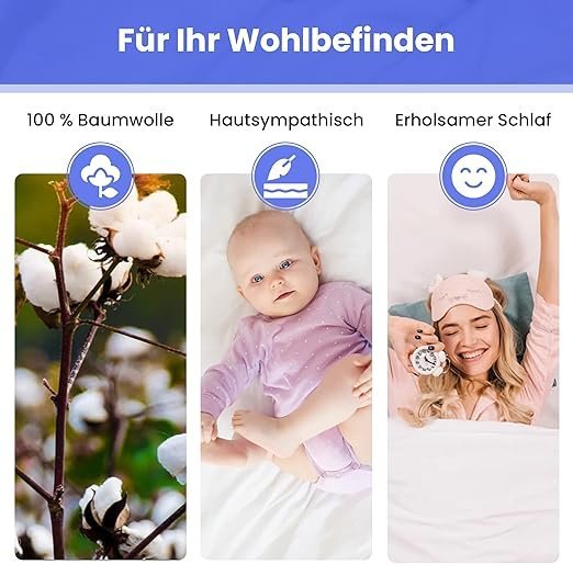 Passend für Matratzen bis ca. 25 cm Höhe (Erwachsenengrößen) und bis ca. 20 cm Höhe (Kinderbettgrößen). Der rundum eingenähte elastische Qualitätsgummizug sorgt für faltenfreien Sitz, sicheren Halt und verhindert das Verrutschen – selbst bei unruhigem Schlaf oder häufigem Beziehen. -