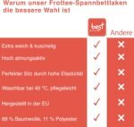2. Dank des rundum vernähten Gummibands passt sich das Spannbettlaken optimal unterschiedlichen Matratzendicken an. Für Erwachsenengrößen ist es bis etwa 25 cm geeignet, für Kinderbettmatratzen bis etwa 20 cm. Der sichere Halt verhindert Verrutschen und sorgt für eine weich anschmiegsame Oberfläche.