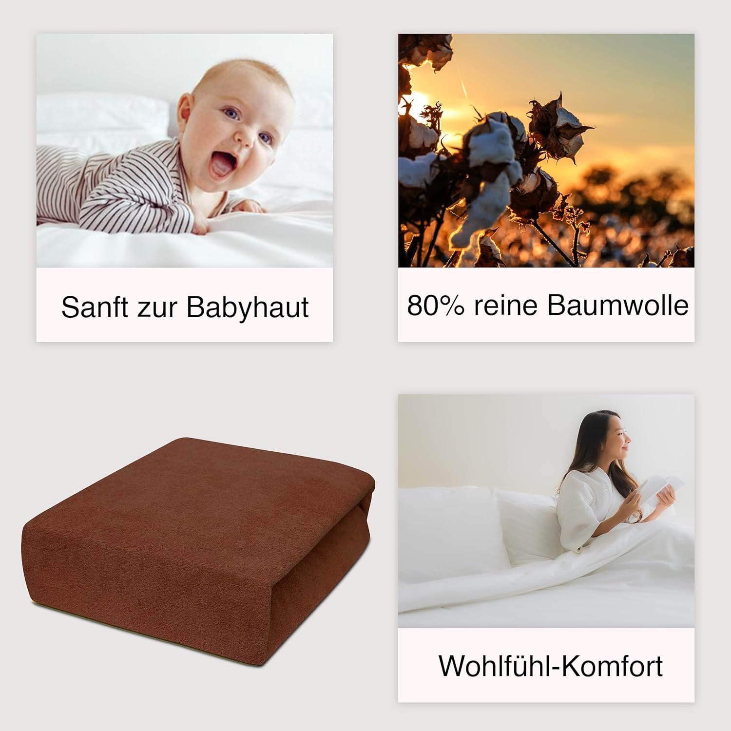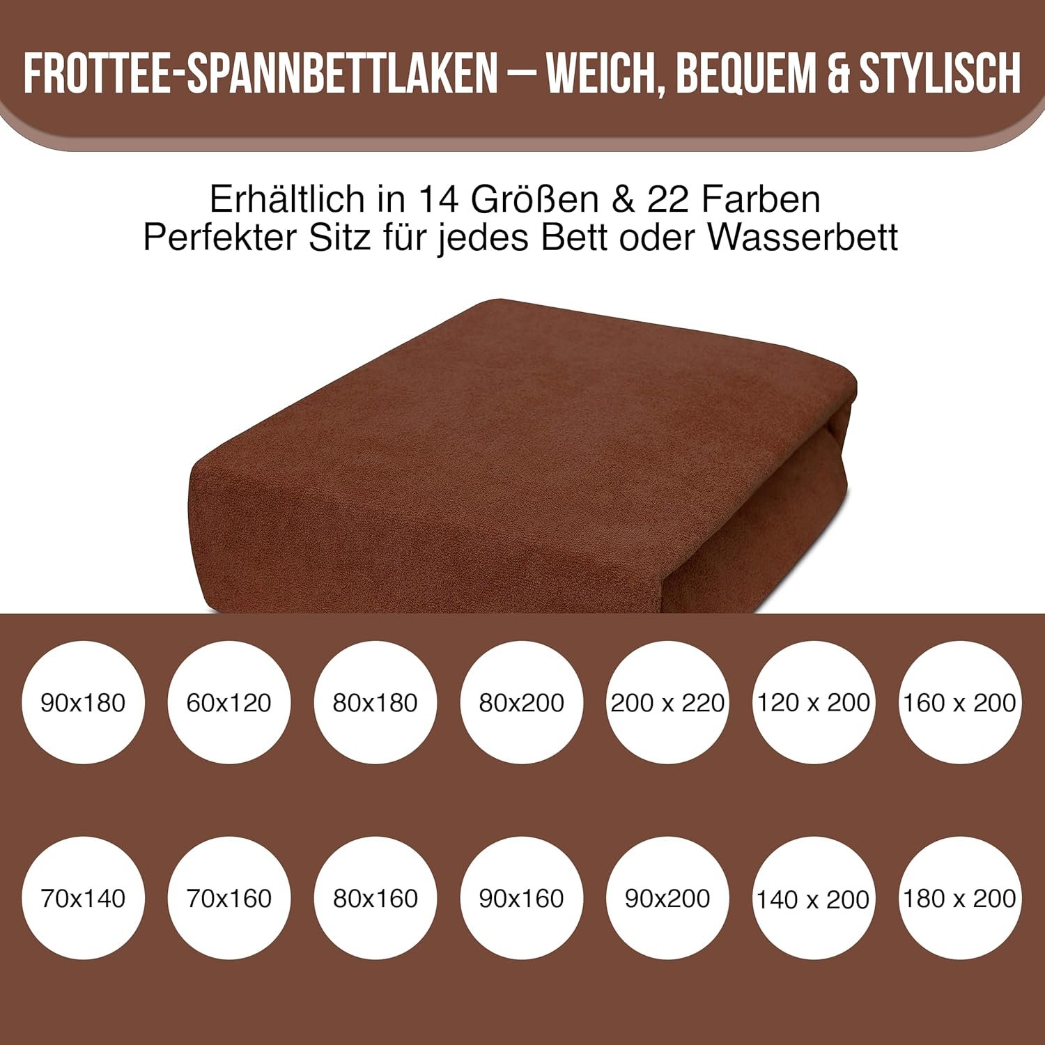 5. Geliefert wird ein einzelnes Spannbettlaken in der jeweils bestellten Farbe und Größe. Farbabweichungen zwischen Abbildung und Original sind möglich: Besonders der Ton Rostbraun kann optisch eher orange wirken, während die Farbe Creme leicht hellgelb erscheint. Diese Unterschiede hängen von Bildschirmdarstellungen und Lichtverhältnissen ab.