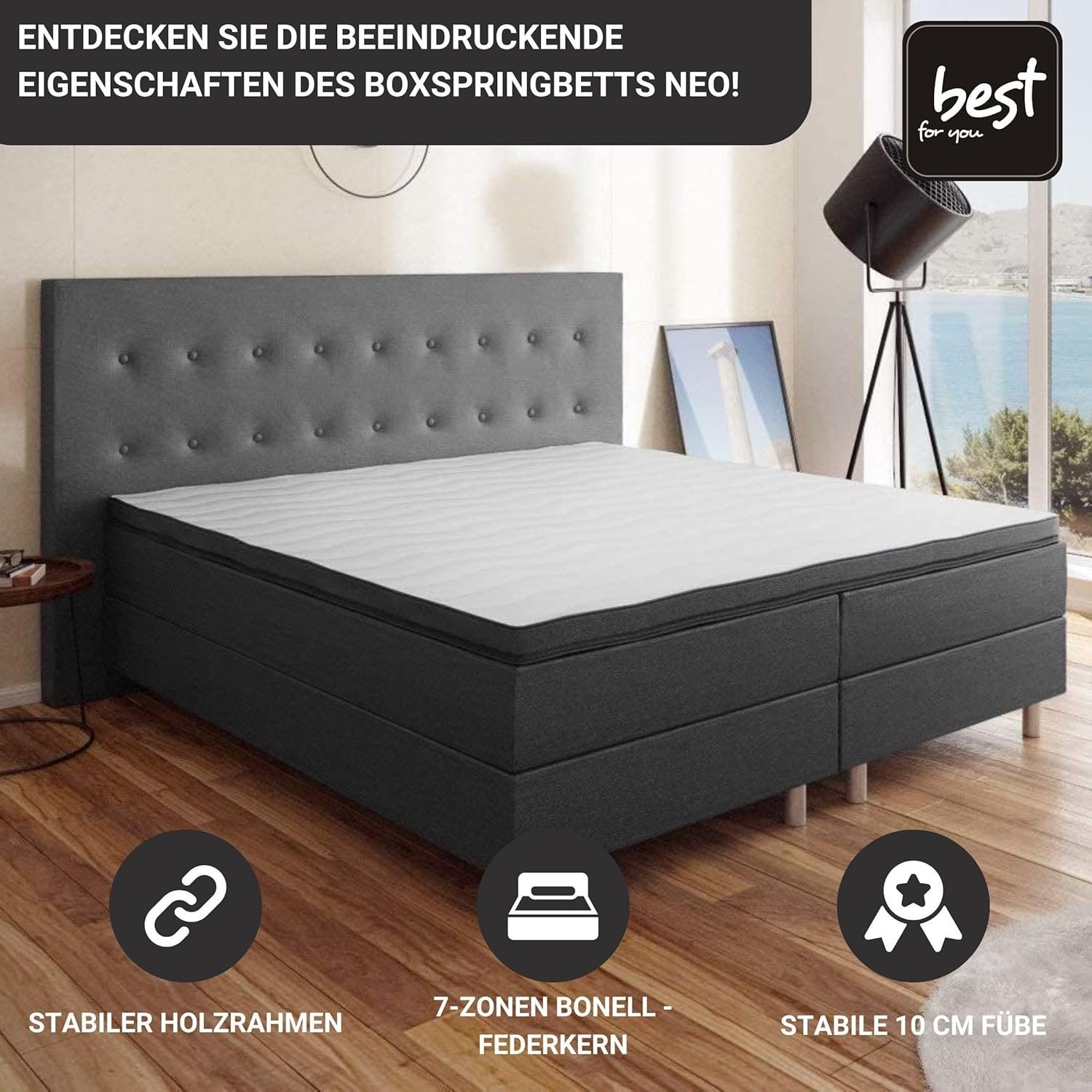 Das Boxspringbett Neo First Class von Best-for-You verbindet stilvolles Design mit hohem Liegekomfort. Die 7-Zonen Bonellfederkern-Matratze bietet eine gleichmäßige Stützung für Schulter, Rücken und Hüfte und sorgt mit Härtegrad H3 für eine mittelfeste bis feste Liegefläche – ideal für Menschen, die eine stabile Unterlage bevorzugen.