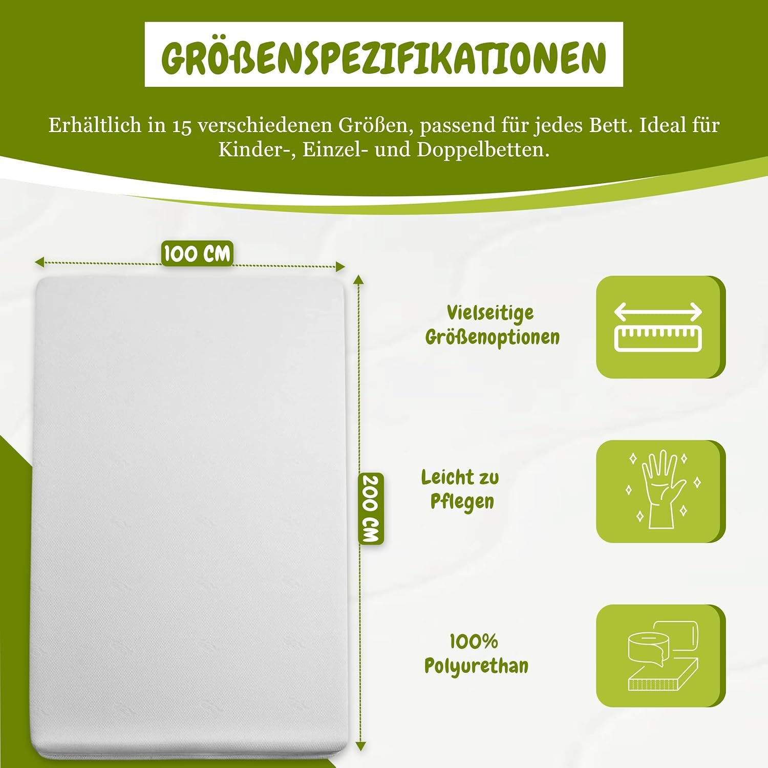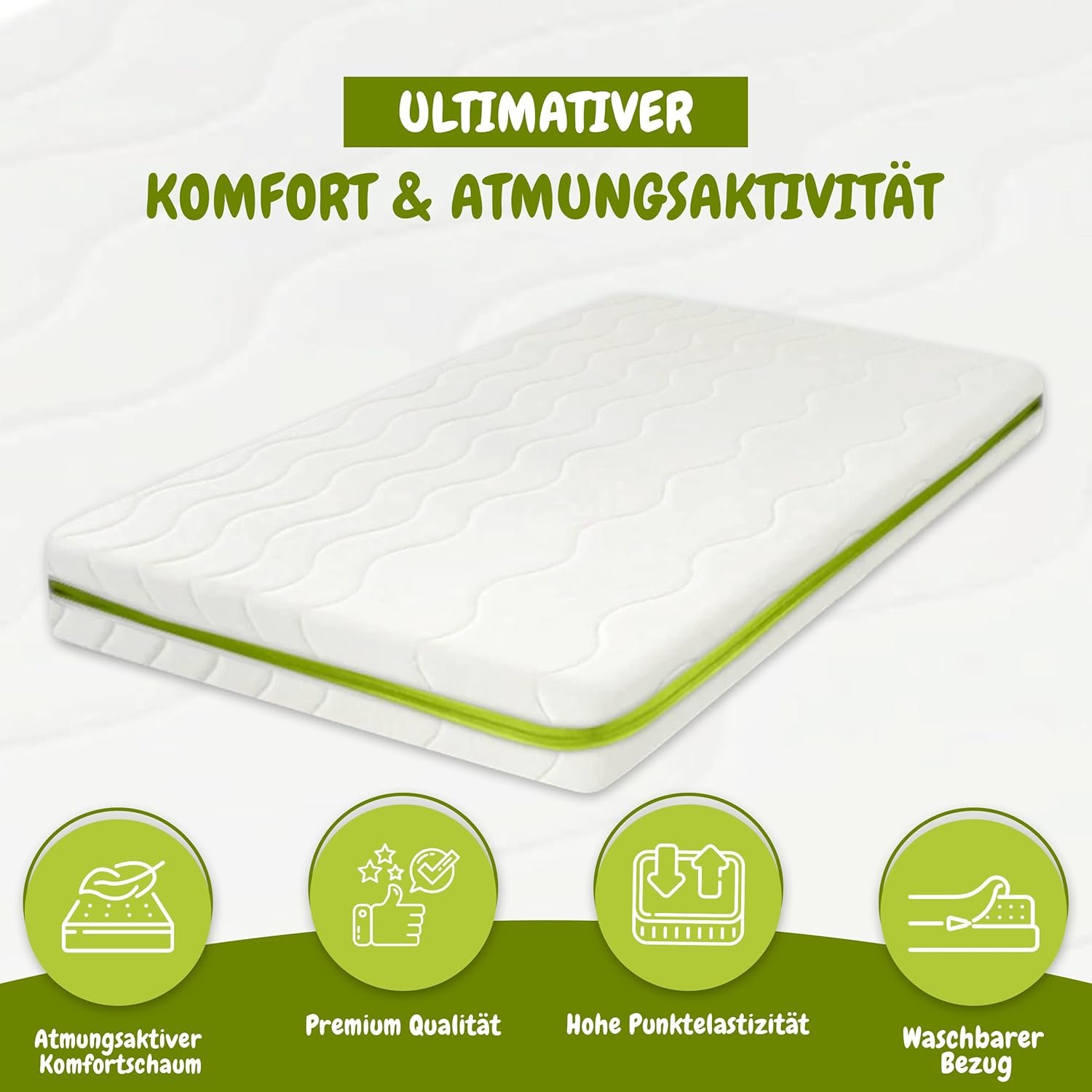 Die Matratze bietet mit ihrem 10 cm hohen Schaumkern und ca. 11 cm Gesamthöhe ein komfortables, stabiles Liegegefühl. Durch TÜV-Zertifizierung und eine breite Auswahl an Farben und Größen eignet sie sich perfekt für Kinderzimmer, Jugendzimmer oder Gästebetten.
