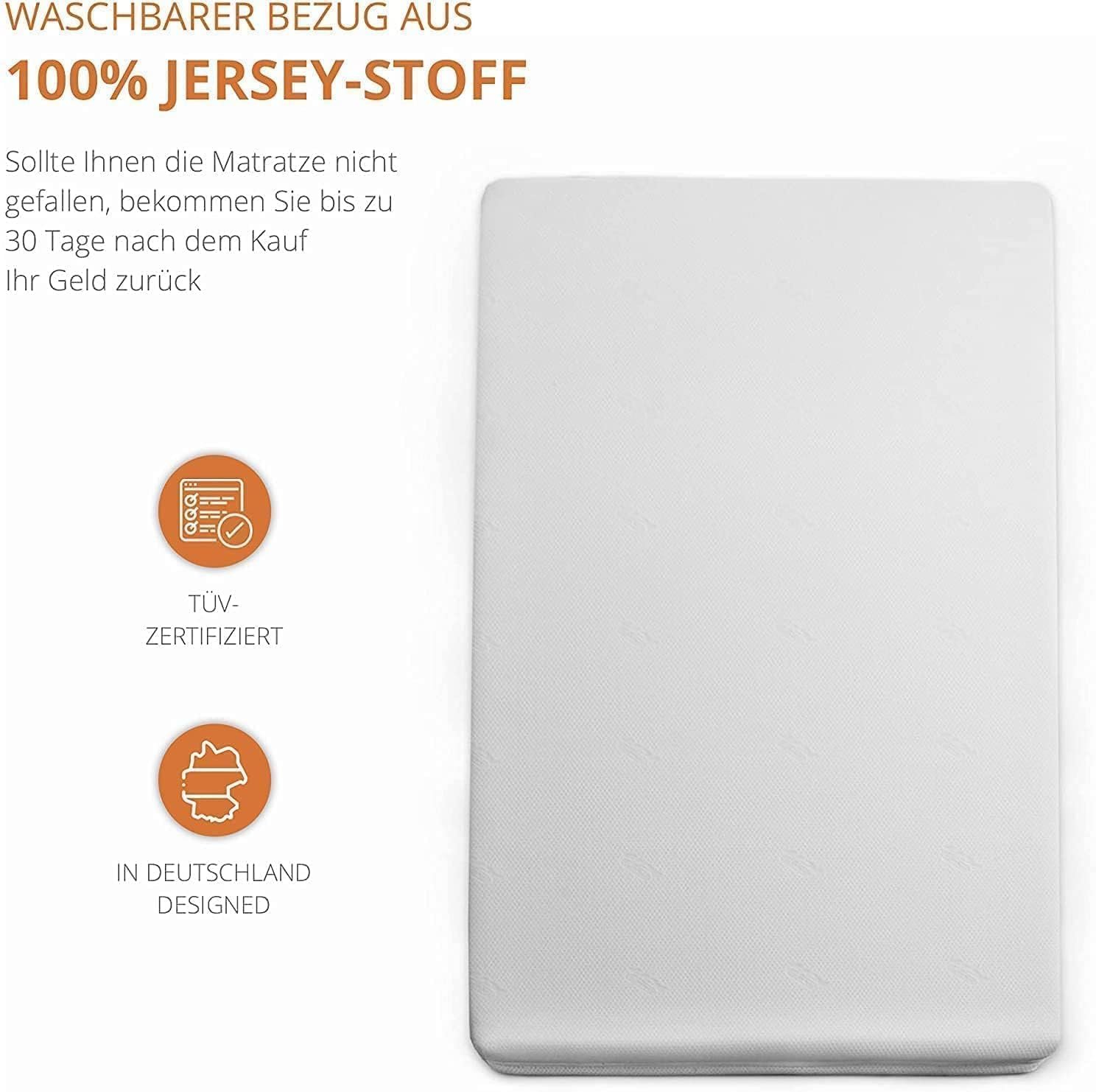 Der hochwertige Jersey-Bezug ist mit einem praktischen Reißverschluss ausgestattet, lässt sich mühelos abnehmen und bei 40°C waschen. Dadurch wird eine besonders einfache Reinigung ermöglicht. Der Bezug ist allergikerfreundlich, hautsympathisch und sorgt dauerhaft für hygienische Frische und ein sauberes Schlafumfeld. -