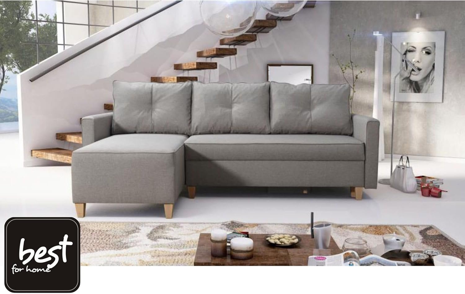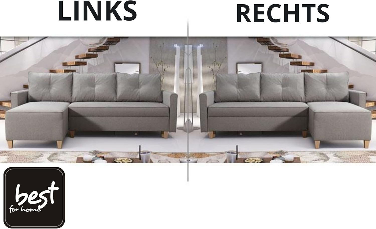 • Modernes Design trifft auf harmonische Anpassungsfähigkeit: Die Eckcouch fügt sich perfekt in verschiedene Einrichtungsstile ein und verleiht jedem Raum eine zeitgemäße Note. Die gelungene Kombination aus Stil, Komfort und Funktionalität macht das Möbelstück optisch und praktisch zum Highlight.