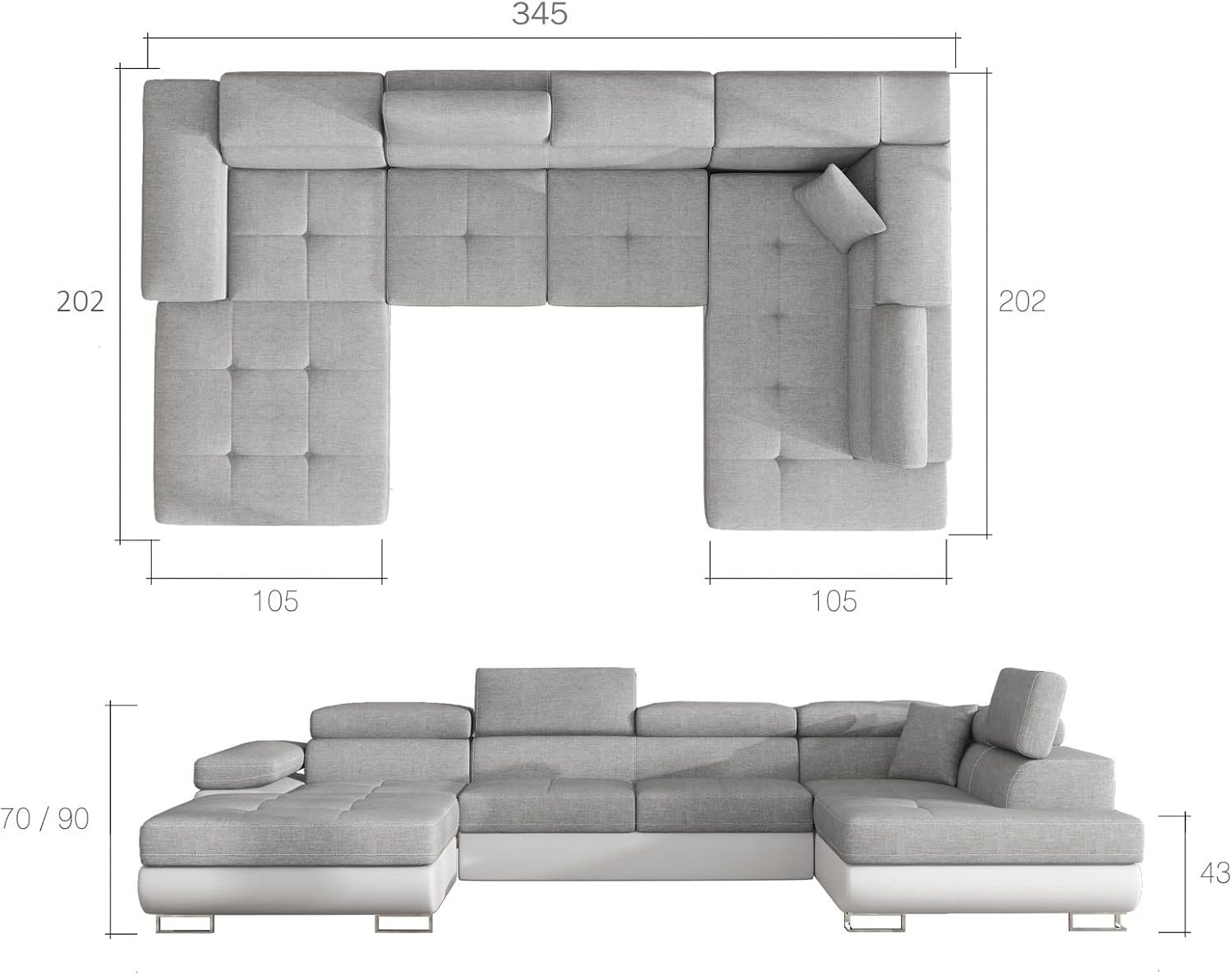 Mit den Abmessungen von 345x202x70-90 cm bietet das Sofa ausreichend Platz für Familie und Gäste. Die großzügige Liegefläche misst 125×266 cm und sorgt für erholsamen Schlafkomfort. -