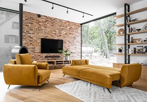 Das Sofa Megis ist eine attraktive Dekoration für Ihr Wohnzimmer. Es bietet maximalen Komfort in einer modernen Atmosphäre. Das Sofa mit einer Breite von 250 cm bietet einen idealen Platz zum Entspannen. Nach dem Ausklappen verwandelt es sich in ein bequemes Bett mit einer Fläche von 200 x 145 cm. Ein zusätzlicher Vorteil des Megis-Sofas ist der geräumige Behälter für Bettzeug, der sich in der Box befindet, so dass Sie Dinge verstecken können, für die Sie zu Hause keinen Platz finden. Das innovative automatische Aufklappsystem DL trägt zur Originalität und Funktionalität des Sofas bei. Dank der Verwendung des besten HR-Schaums und der gewellten Federn vom Typ B verformt sich das Sofa Megis nicht, was eine phänomenale Lösung für die Langlebigkeit des Produkts ist.
