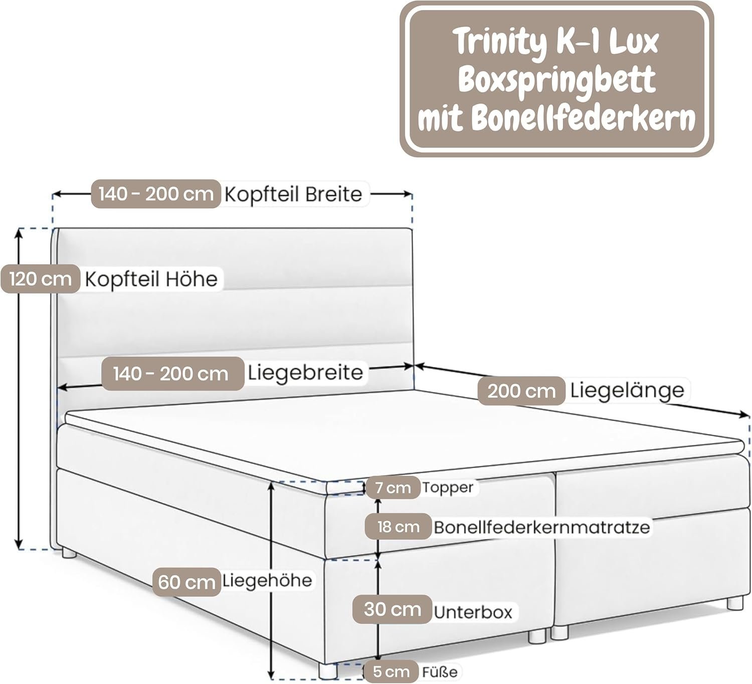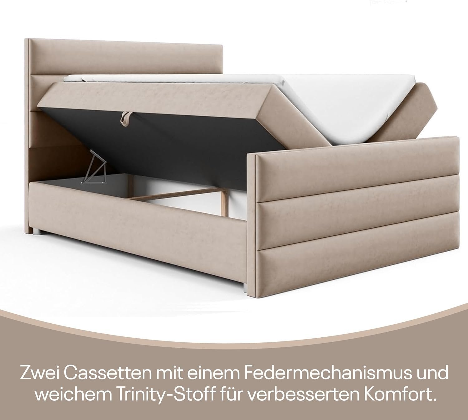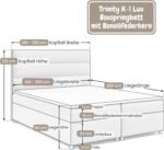 - LUXURY FEEL WITH SKIN FRIENDLY TRINITY FABRIC This bed with mattress offers a touch of luxury thanks to the skin-friendly, soft and cuddly Trinity fabric. The robust workmanship of the upholstered bed ensures durability and resistance to everyday use without losing softness. The Trinity fabric of the box spring bed is gentle on the skin and creates a cozy, inviting sleeping environment.