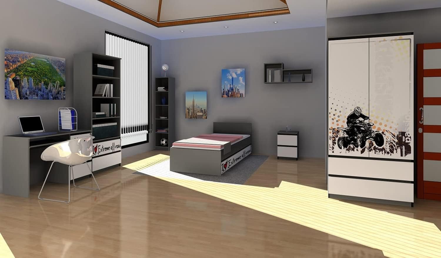 Kinderzimmer Jugendzimmer Komplett Set Off Road (Set, 8-St., Bett mit 10 cm Matratze + Schreibtisch + Kleiderschrank + 2 Regal + Nachtisch + Hängendes Regal)