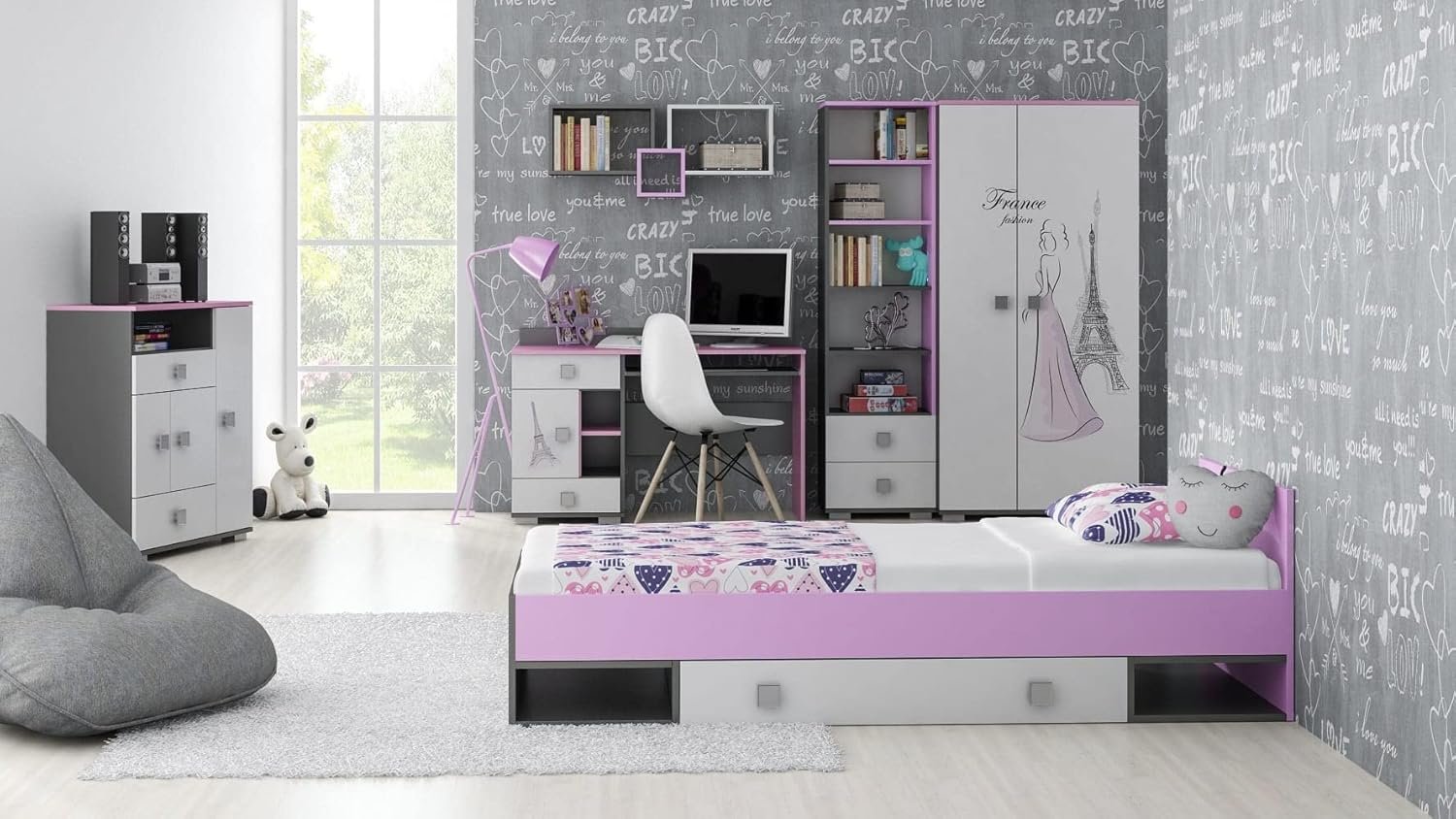 Kinderzimmer Jugendzimmer Komplett Set Paris (Set, 7-St., Bett mit 10 cm Matratze + Schreibtisch + Kleiderschrank + Kommode + Regal + Hängendes Regal)