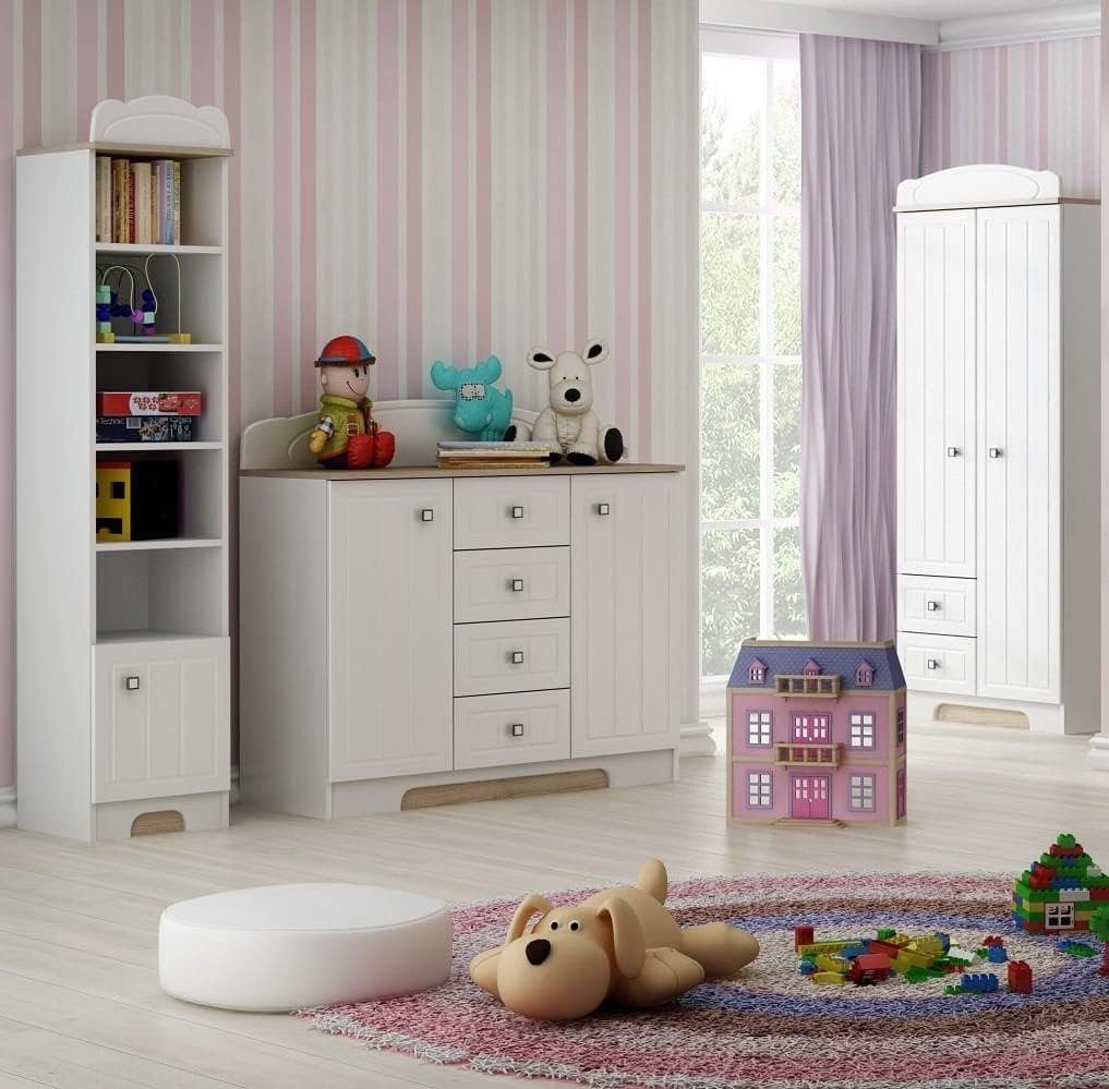 Dieses Kindermöbel-Set umfasst Kleiderschrank, Kommode und Regal und bietet damit eine kompakte, funktionale Einrichtungslösung für das Kinderzimmer. Alle Elemente sind sorgfältig aufeinander abgestimmt, schaffen Ordnung und unterstützen spielerisch die Organisation von Kleidung, Spielzeug und persönlichen Gegenständen.
