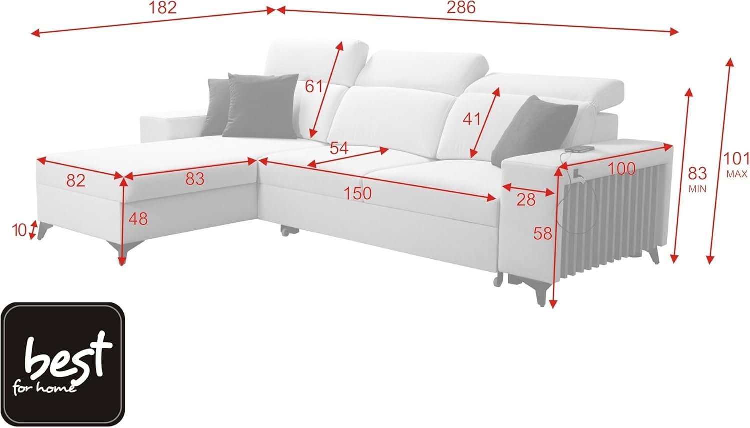 With generous proportions, this corner sofa provides plenty of room for sitting, lounging, and sleeping. It measures approximately 286 cm in width with depths of 100 cm and 182 cm, offering a large seating area. The fold-out sleeping surface measures about 230 × 122 cm, giving guests a comfortable place to rest while maintaining practicality for everyday use.