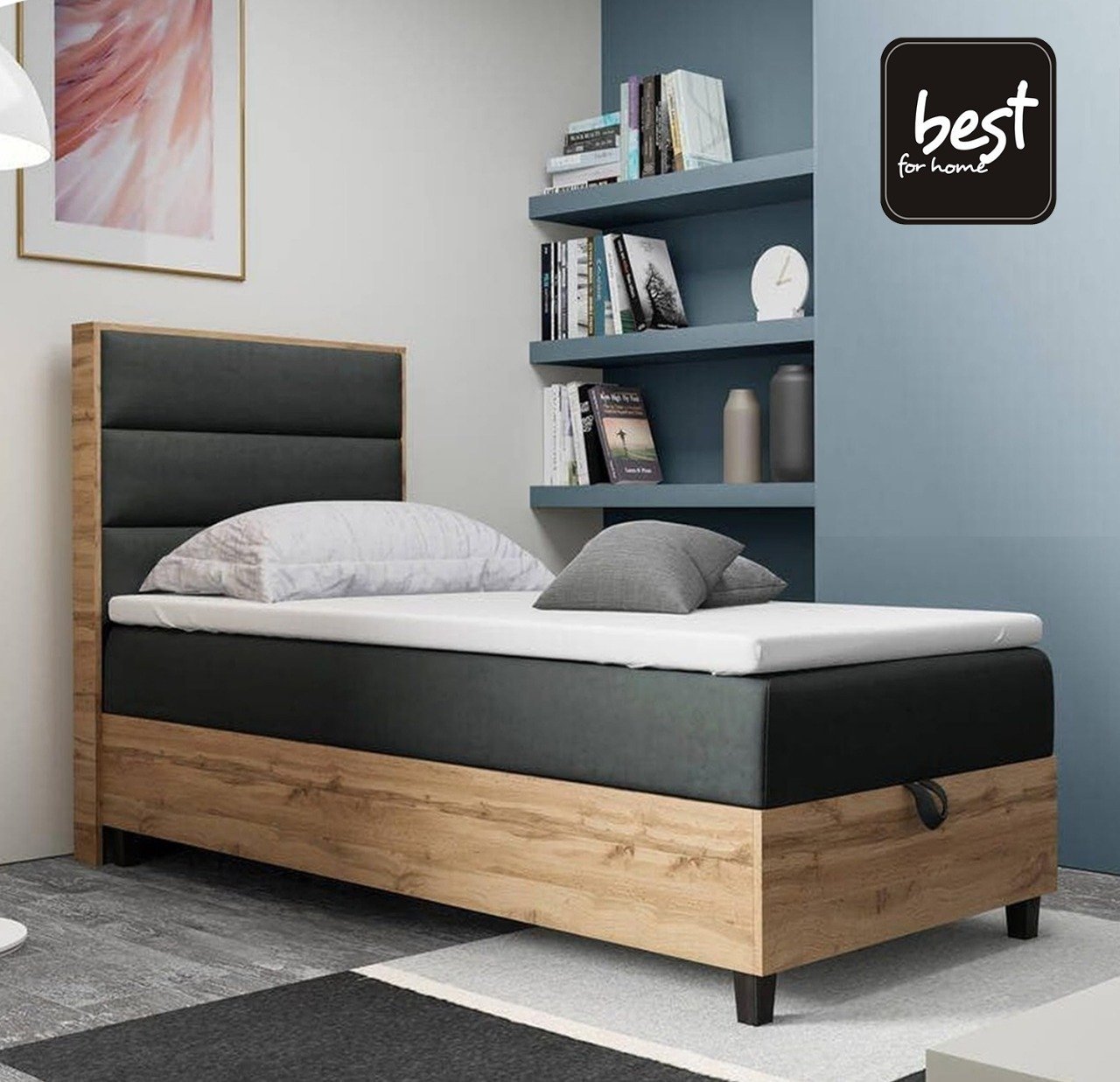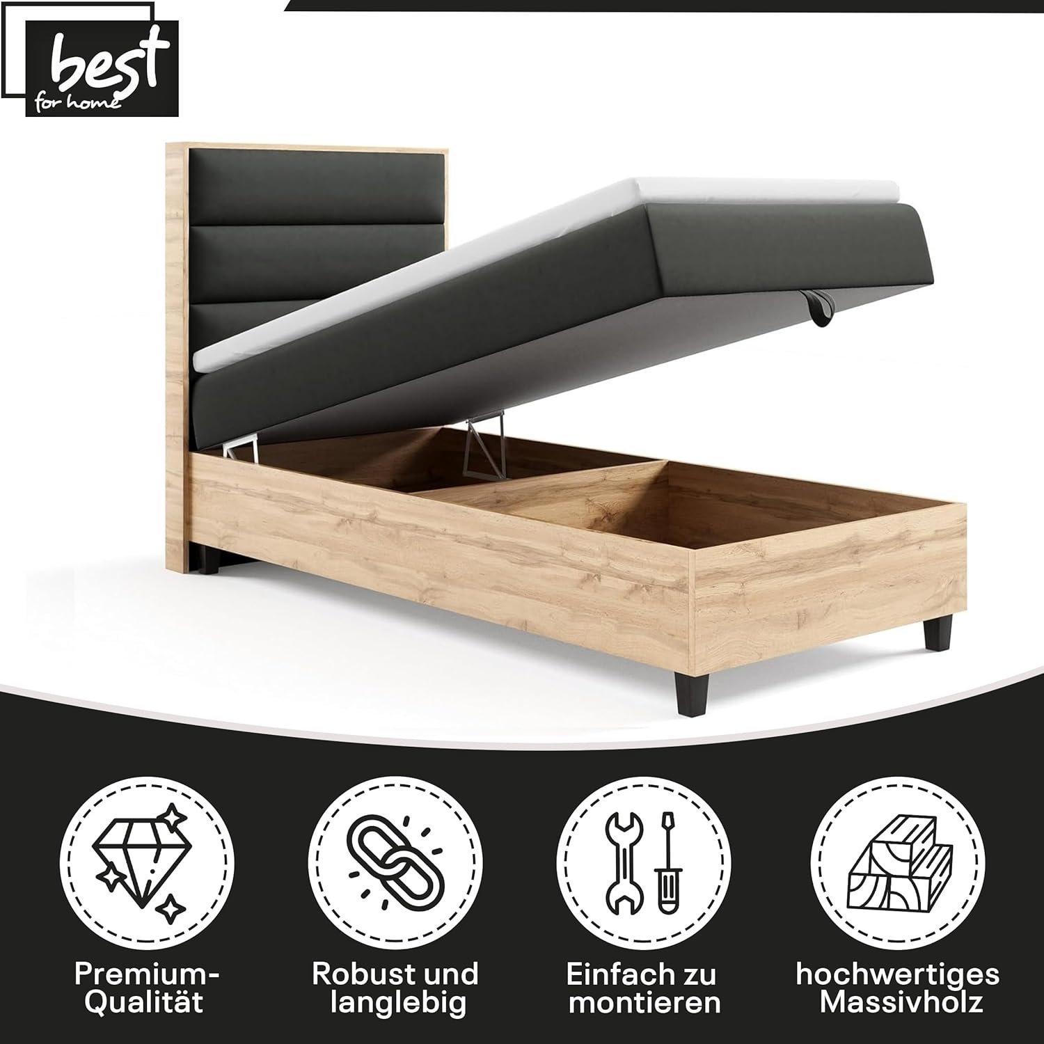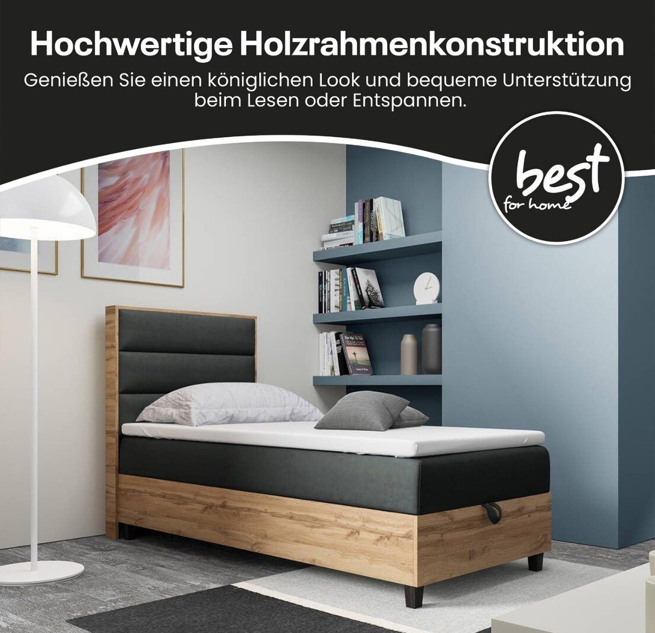Best For Home Trinity K-1 Einzel Boxspringbett mit Matratze und Stauraum | Bonellfederkern Einzelbett inkl. Topper | Bett mit Bettkasten 70×200 | Gepolsterte Kopfteil Bett – Liefer und Aufbauservice